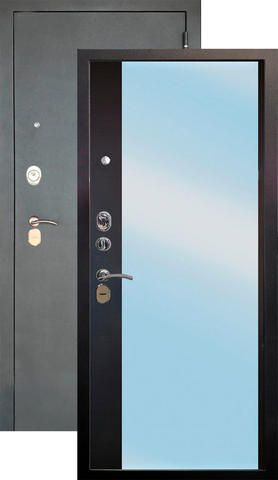 Повышенной надежности российская утепленная дверь с большим зеркалом на внутренней панели со стильной внешней отделкой муар черный. Прекрасно подойдет для установки в квартиру. Солидная модель, которая хорошо защитит и подчеркнет статус.