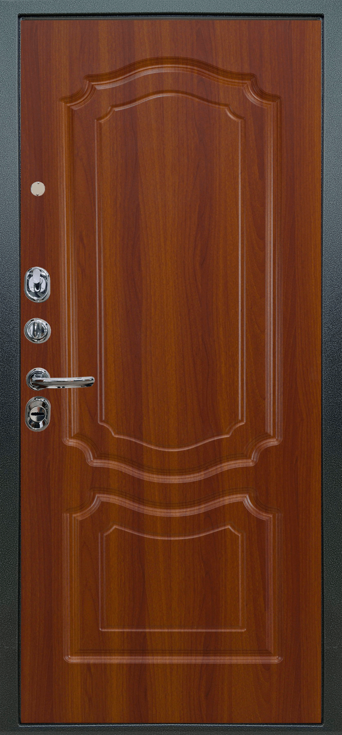 Имеет высокую прочность, благодаря толщине стали 1,8 мм. Оснащена двумя надежными замками, минимум один из которых имеет высший класс взломостойкости по ГОСТ 5089-2003 (4 класс). Есть врезная броненакладка, защищающая цилиндровый замок от высверливания. Она утоплена в дверное полотно, поэтому ее практически невозможно сбить. Есть ночная задвижка — дополнительная защита от взлома. Никто не сможет зайти, вскрыв замок, когда вы дома.